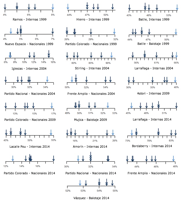 Si consideramos los procesos electorales nacionales en Uruguay desde 1999 a 2014, y consideramos los candidatos que obtuvieron más de un 4% de su partido en las internas o del total en las nacionales, para los que hay al menos 5 encuestas, se genera un universo de 43 casos.